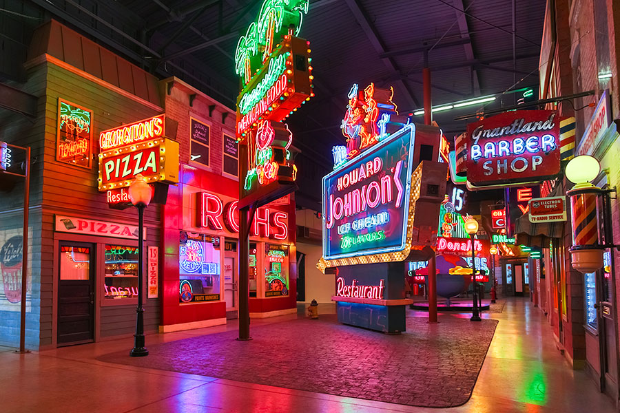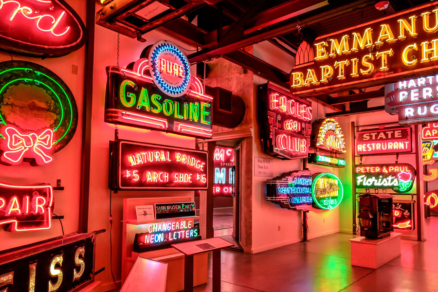 Learn more while taking the audio tour on your phone. Explaining the larger topics, as well as surprising stories about the signs themselves, paints a clearer picture of the collection and is highly recommended. Don’t forget to check out Neonworks of Cincinnati, the full-time neon workshop located inside of the museum! You can see tube-benders working their craft making signs for sign companies today.
